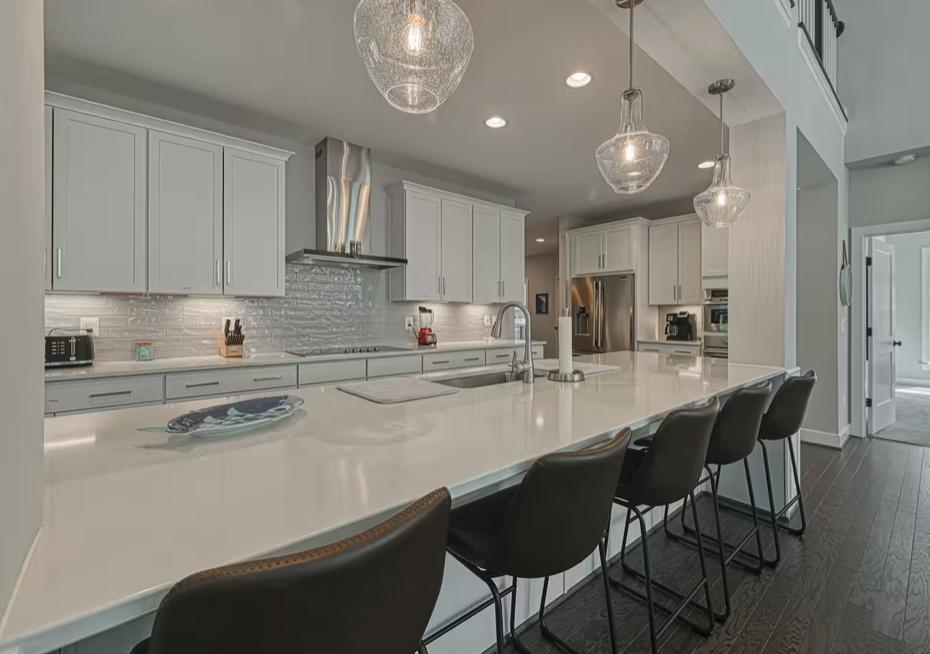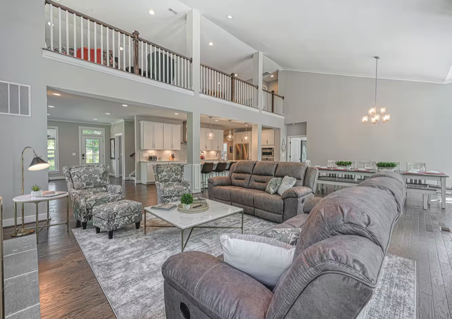 The Main floor has an expansive kitchen, huge dining table, cozy furniture and an open floor plan.